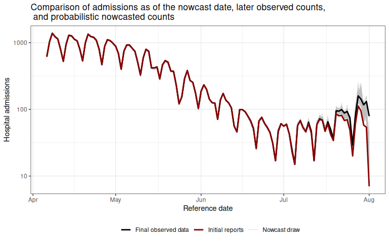 ggtitle("Comparison of admissions as of the nowcast date, later observed counts, \n and probabilistic nowcasted counts") # nolintCode