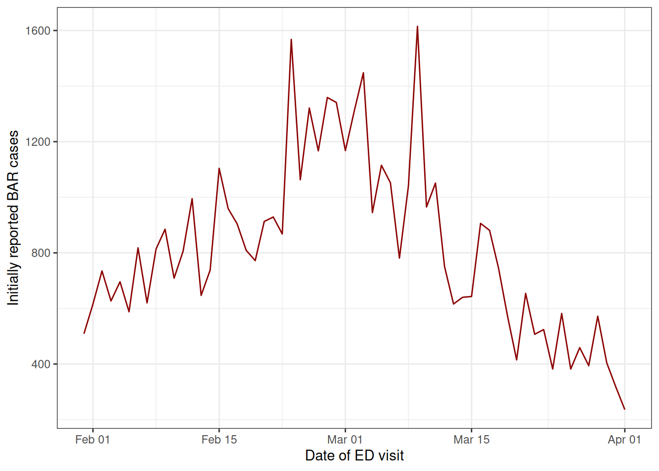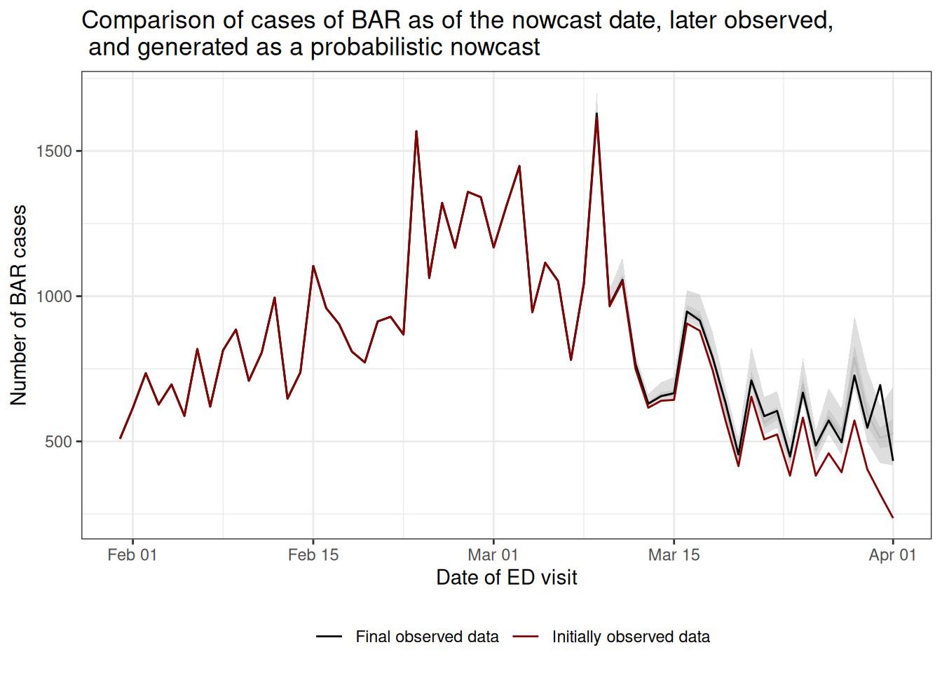 The plot shows that, had we naively summarised the initial reports by reference date (red), it would have appeared as if the recent cases of BAR were declining rapidly.
